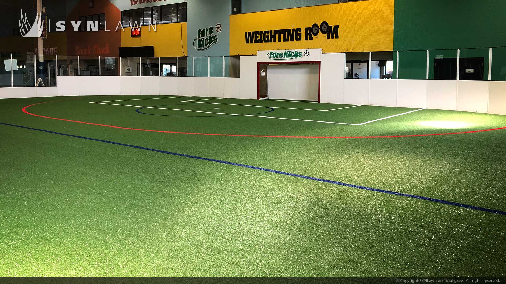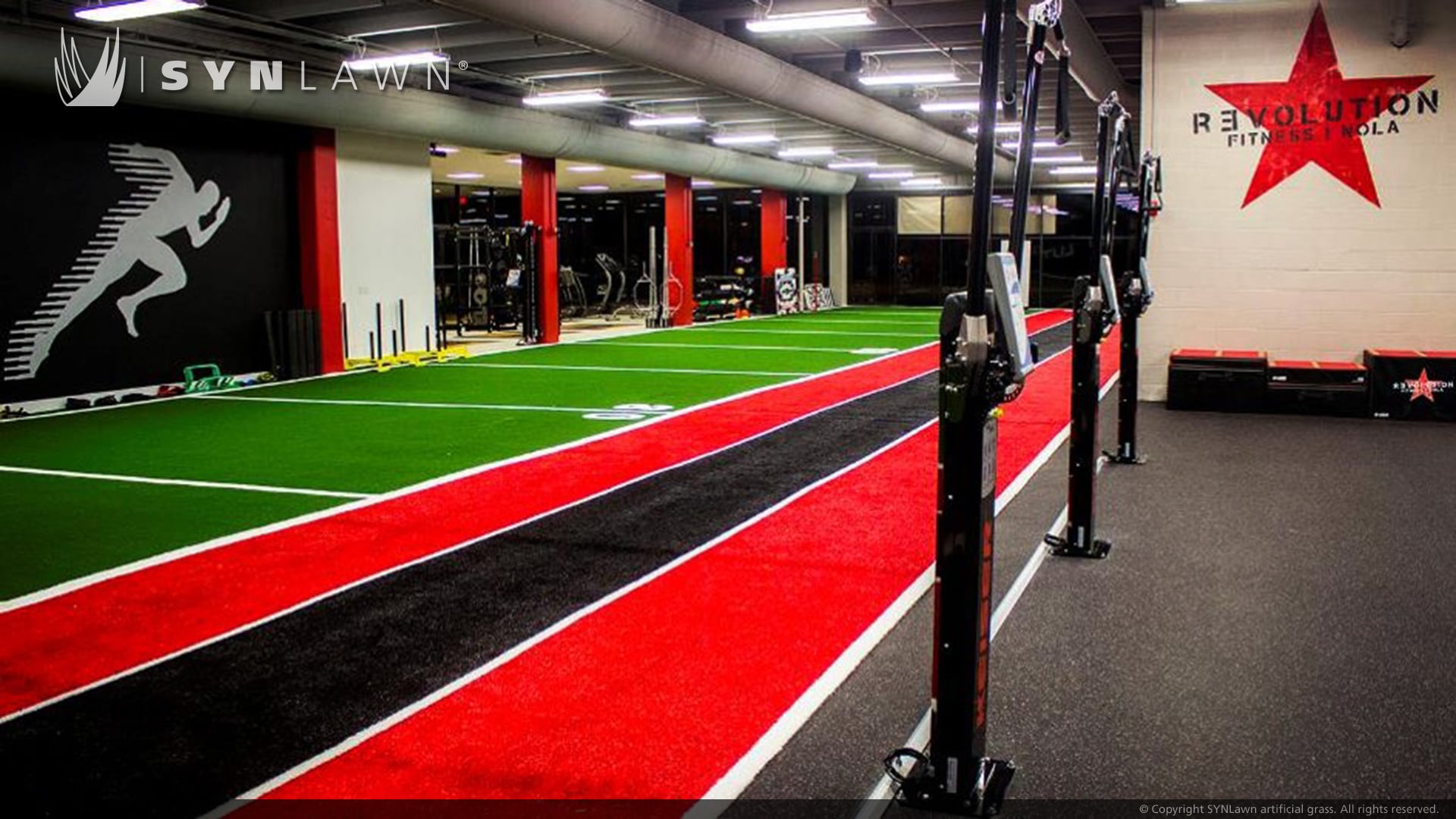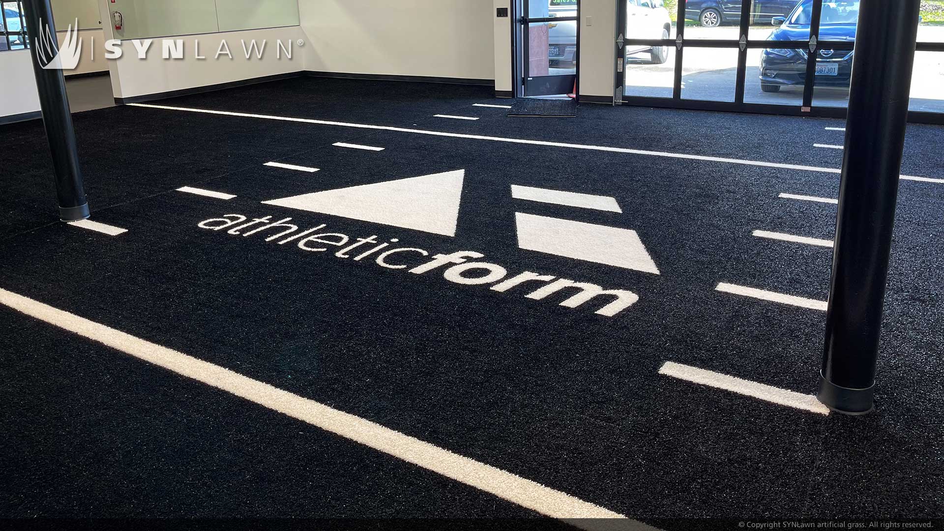 SpeedTurf™ by SYNLawn is ideal for strength and agility training, sled pulls, indoor shot-put/hammer training, cross-training, gym floors, weight-lifting areas, batting cages, soccer fields, and tennis courts. White lines are tufted into the turf, eliminating seams at critical stress points, which enables the turf to withstand rigorous foot traffic and wear. No infill for easy maintenance and cleanup. Five-millimeter padding absorbs impact energy.